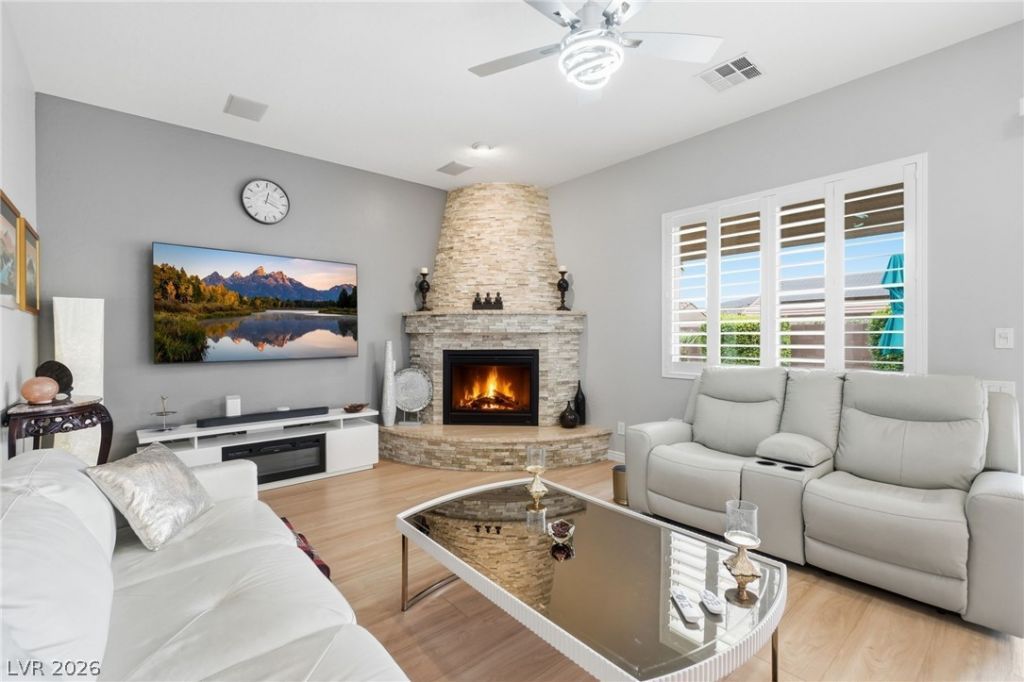 Experience elevated single-story living in the heart of Inspirada. This beautifully designed home offers a seamless blend of comfort, privacy, and modern style, featuring a highly sought-after next-gen layout with a private entrance?ideal for multigenerational living, guests, or a flexible home office setup. 10-foot ceilings and an open-concept design create a light-filled, airy feel throughout. The chef's kitchen with quartz countertops, a large island, double ovens, and under-cabinet lighting?perfect for both everyday living and entertaining. The primary suite is a true retreat, complete with a private patio, dual walk-in closets, and a spa-inspired bath featuring a soaking tub, walk-in shower, and refined finishes throughout. Surround sound wiring, dimmable lighting, and a fireplace enhance the home's modern comfort and ambiance. Oversized backyard featuring pavers, turf, a covered patio, and a firepit lounge area with exceptional privacy and no rear neighbors overlooking.