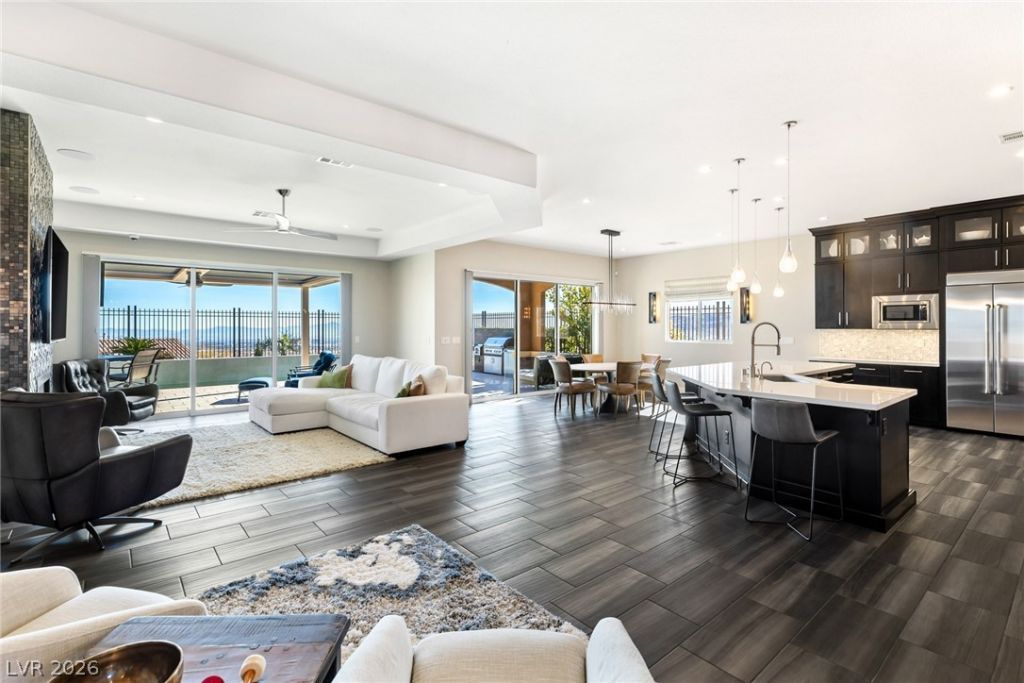 Experience refined luxury in this single-story Toll Brothers home with three bedrooms plus office/den in the prestigious Montecito community. Perched on an elevated end-of-cul-de-sac lot, the home captures panoramic Strip views and surrounding mountains. A private courtyard with fireplace welcomes you to a striking pivot front door and bright open floor plan. The chef's kitchen with JennAir appliances flows into expansive living areas, enhanced by sliding glass doors spanning the entire rear for seamless indoor-outdoor living. The home offers potential for multigenerational living, featuring a bedroom with adjacent living space and private entrance. The primary suite offers a spa bath with steam shower, custom closet, and private jacuzzi with dramatic two-sided fireplace. The backyard showcases a beautifully designed view lot with sleek pool, two tanning decks, spa, and outdoor kitchen. Additional highlights include custom closets, Murphy bed, and spacious garage with cabinetry.